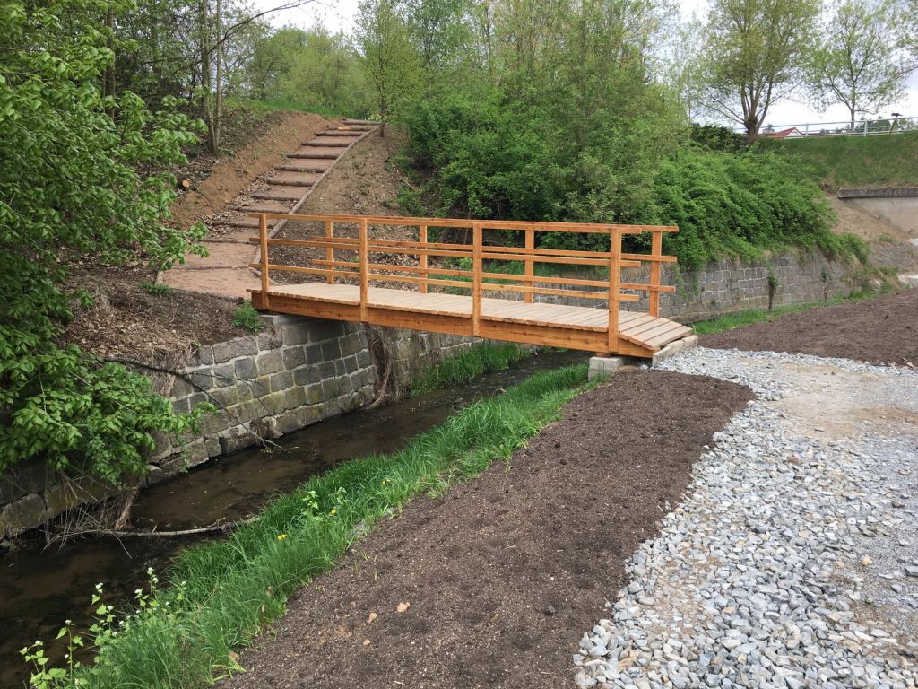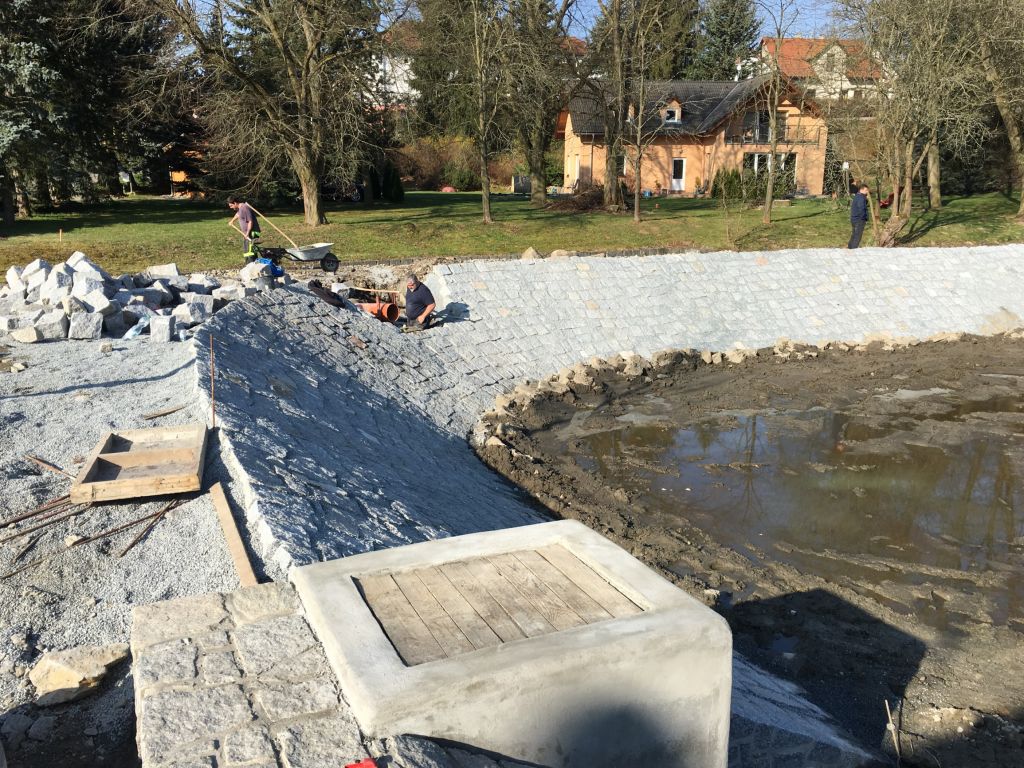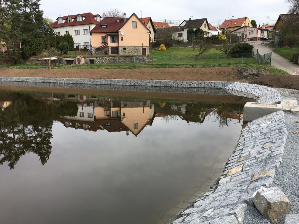 - nové dlážděné břehy, opěrná gabiónová zeď na východní straně, obnova původní severní zdi
