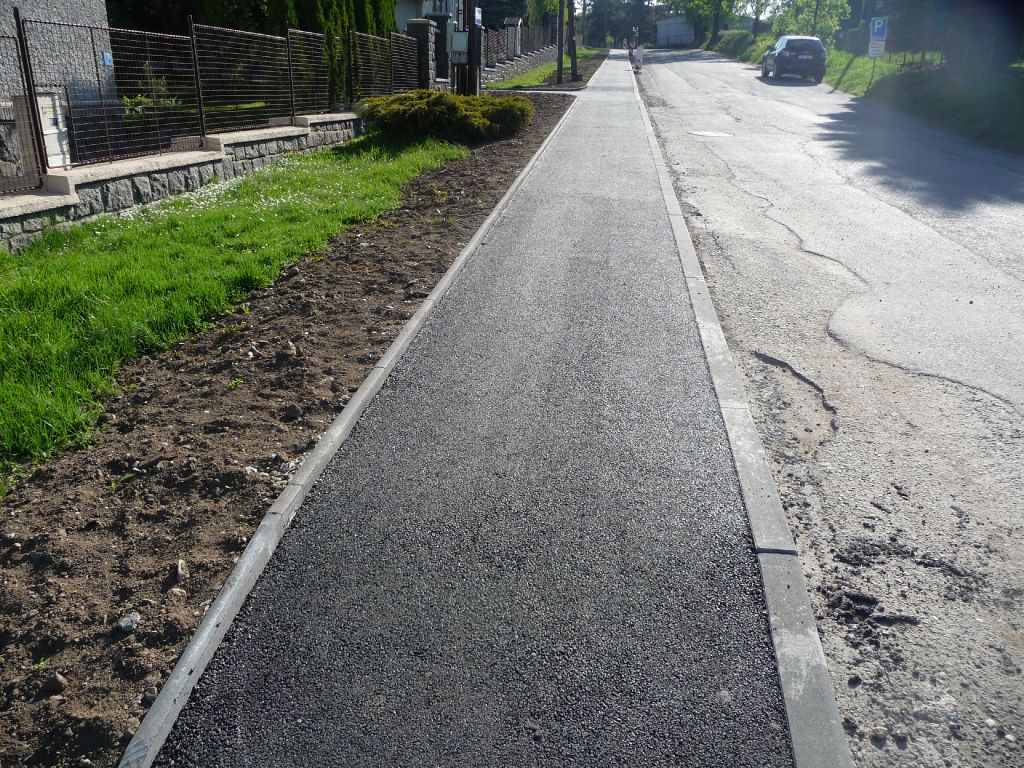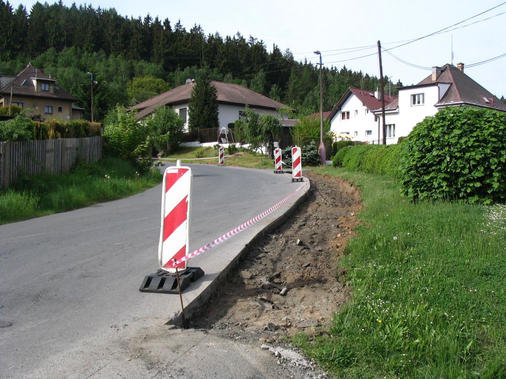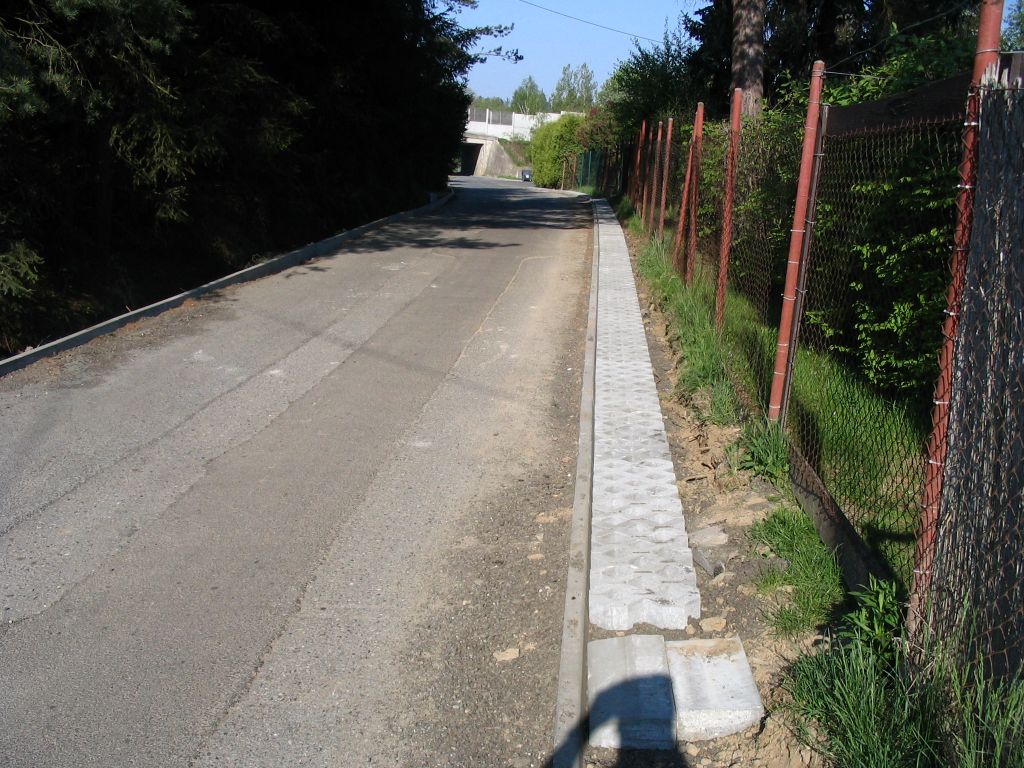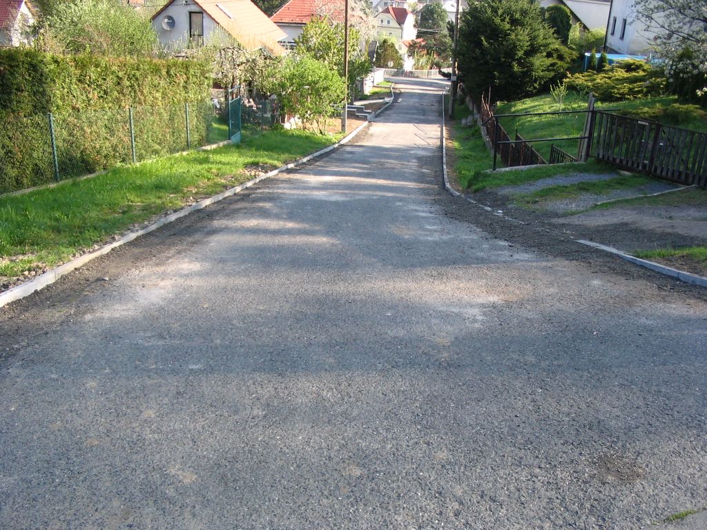 - obruby, asfaltový povrch, zpomalovací prahy, dopravní značení